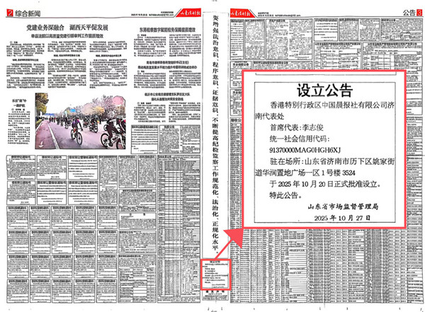 日前,中国晨报社有限公司济南代表处完成法定登记流程,在山东正式落地运营。该代表处选址济南,将以山东为重要支点面向全国开展工作,为香港、澳门与内地的信息互通、文化联动开辟新通道。
