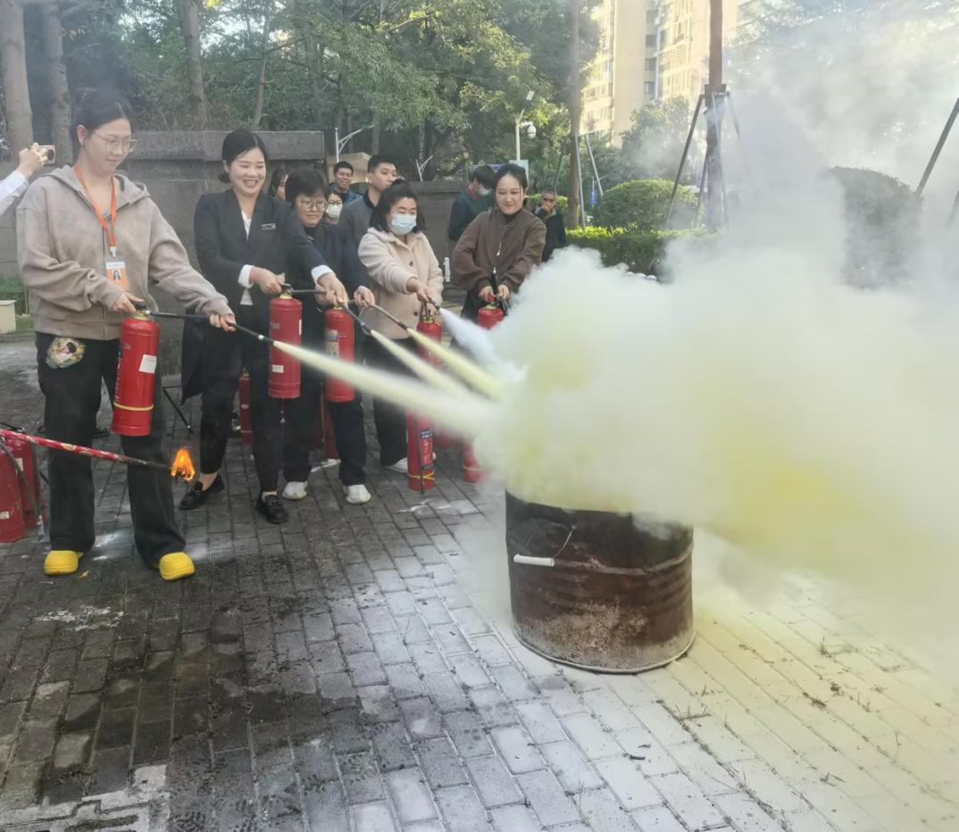 演练模拟办公区域突发火灾,随着急促消防警报响起,全体人员在安全员指挥下,迅速采取捂口鼻、低姿弯腰的正确姿势,按照预设疏散路线快速有序撤离。全程无推挤慌乱,仅用2分37秒便安全抵达指定集合区域,并高效清点人数上报,体现规范的组织流程。大厦安全员随后系统讲解灭火器、消防栓等器材功能,现场演示干粉灭火器“提、拔、握、压”操作要领,并强调日常维护要点。在安全实操环节,部分员工分组对准模拟火源根部精准喷射,通过反复练习熟练掌握灭火技能,切实提升应急响应能力。