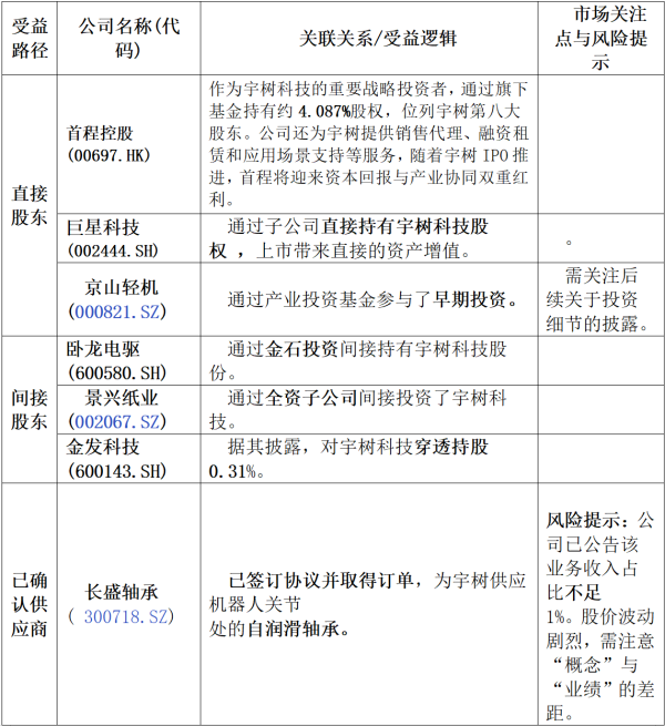 第一类:股权或准股权受益型概念股;这类公司通过直接或间接持有宇树科技股权,在其上市后有望获得账面价值重估,属于典型的“资本化受益”路径。其投资收益高度依赖宇树科技上市后的市值水平、锁定期安排以及后续退出节奏。